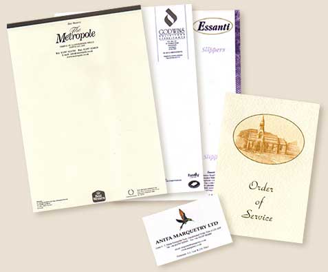 Portfolio Business & Personal Stationery Using high quality inks, paper and card stock, we can provide your comapny with a range of business stationery - letterheads, compliment slips, business cards, invoice books and printed envelopes. We also provide a range of pre-printed wedding stationery. Alternatively, you can provide your own artwork or take advantage of our in-house designers and artists to produce stunning individual personal designs.