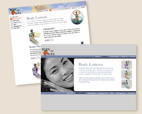 Portfolio Website Design We build great web sites for great companies. We are passionate about delivering robust scalable customer-focused solutions that provide measurable benefits to our clients' businesses. The two examples on the right are initial designs for the Body & Soul company. We are providing full design, database creation and e-commerce facilities for this project